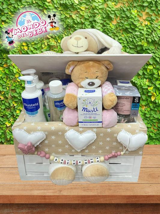 CESTA NASCITA CON PRODOTTI MUSTELACesta nascita da personalizzare con il nome completa di : BAGNOSCHIUMA MUSTELA SHAMPOO MUSTELA PASTA LENITIVA MUSTELA OLIO CORPO MUSTELA AMIDO DI RISO MUSTELA SALVIETTE MUSTELA PAMPERS PANNOLINI QUADROTTI BASTONCINI OVATTATI SPUGNA BIBERON SUCCHIETTO CLIP SUCCHETTO CUSTODIA SUCCHIETTO KIT SPAZZOLA, FORBICI, TAGLIA UNGHIE, LIMA...