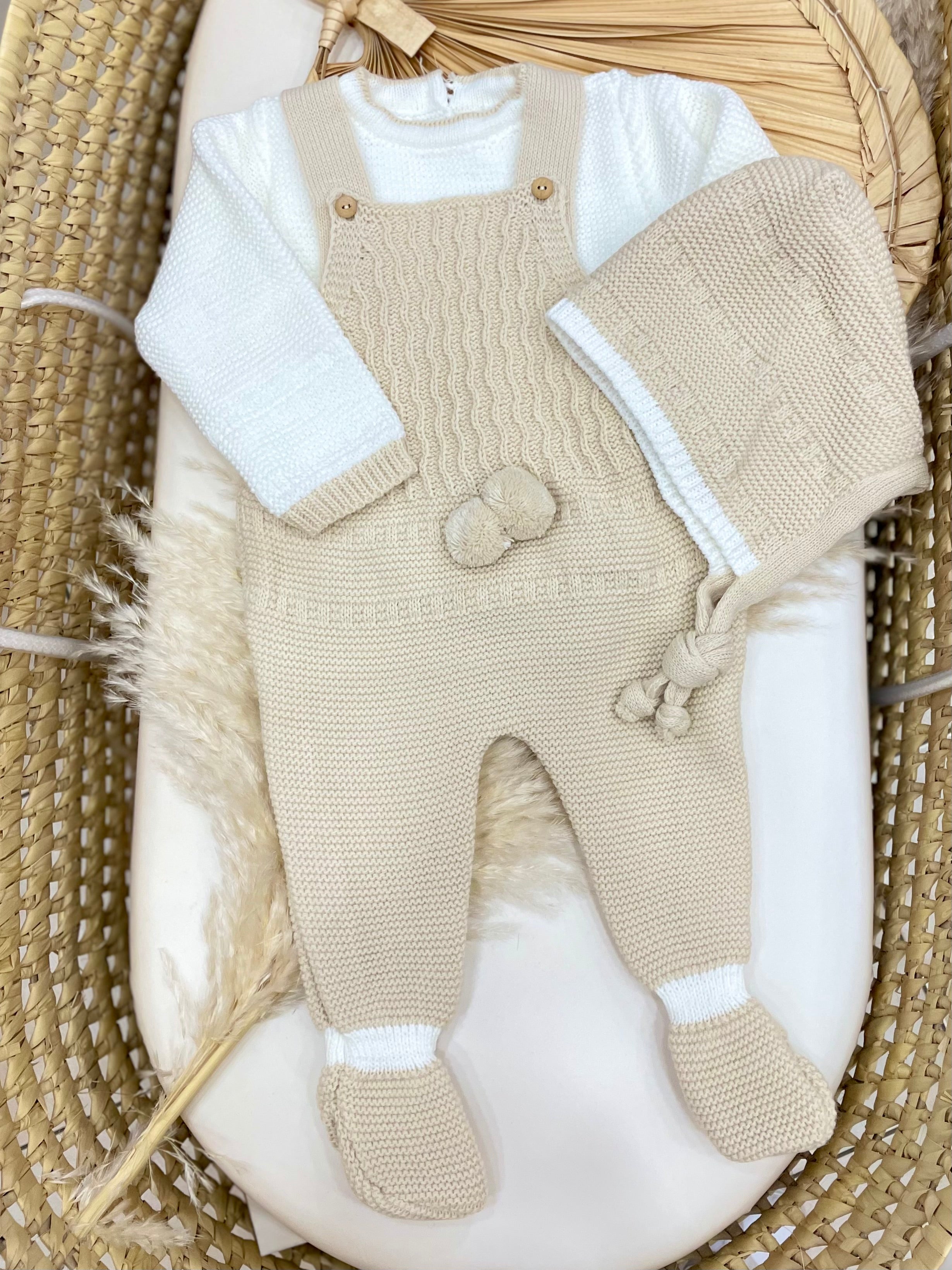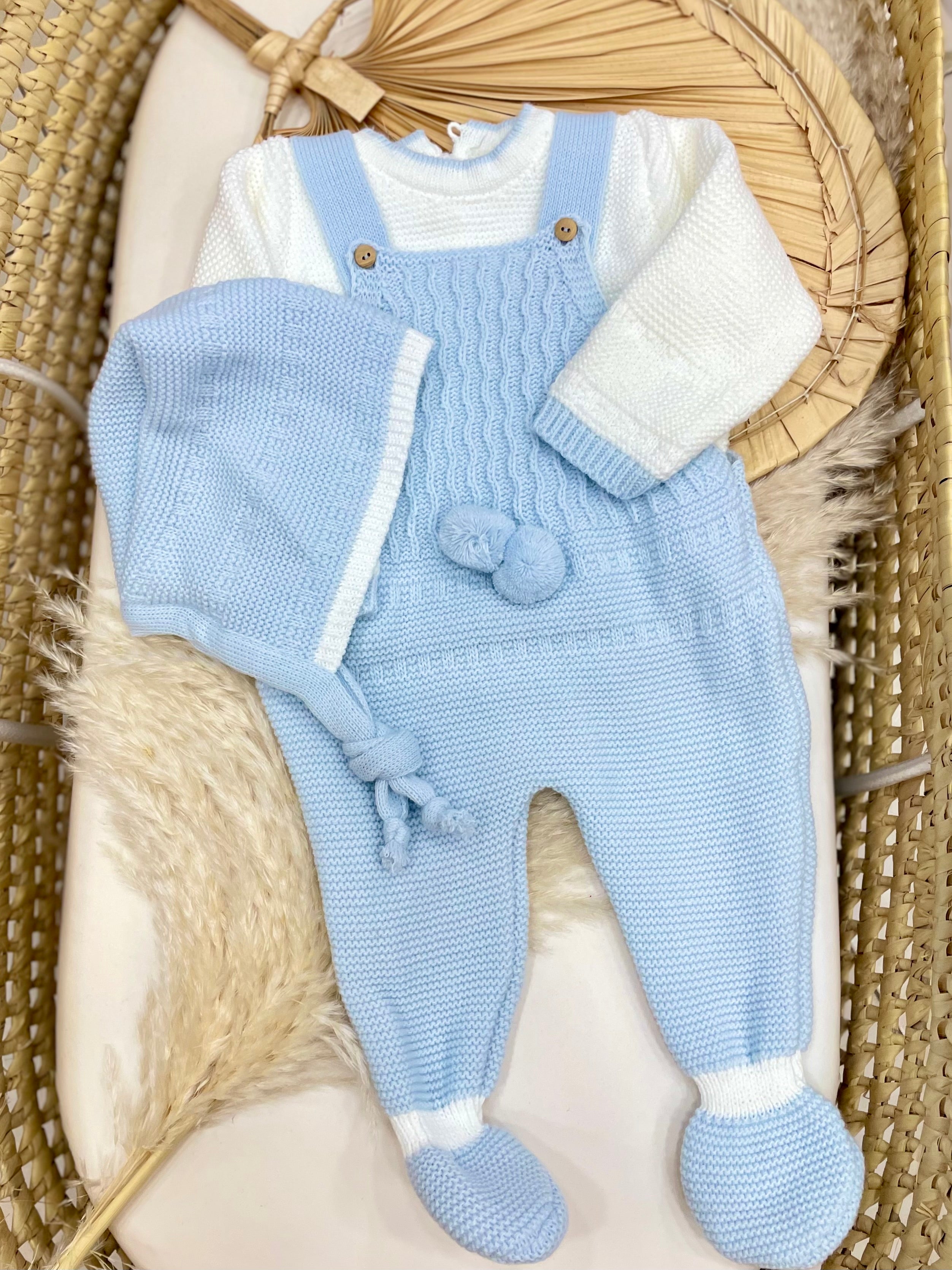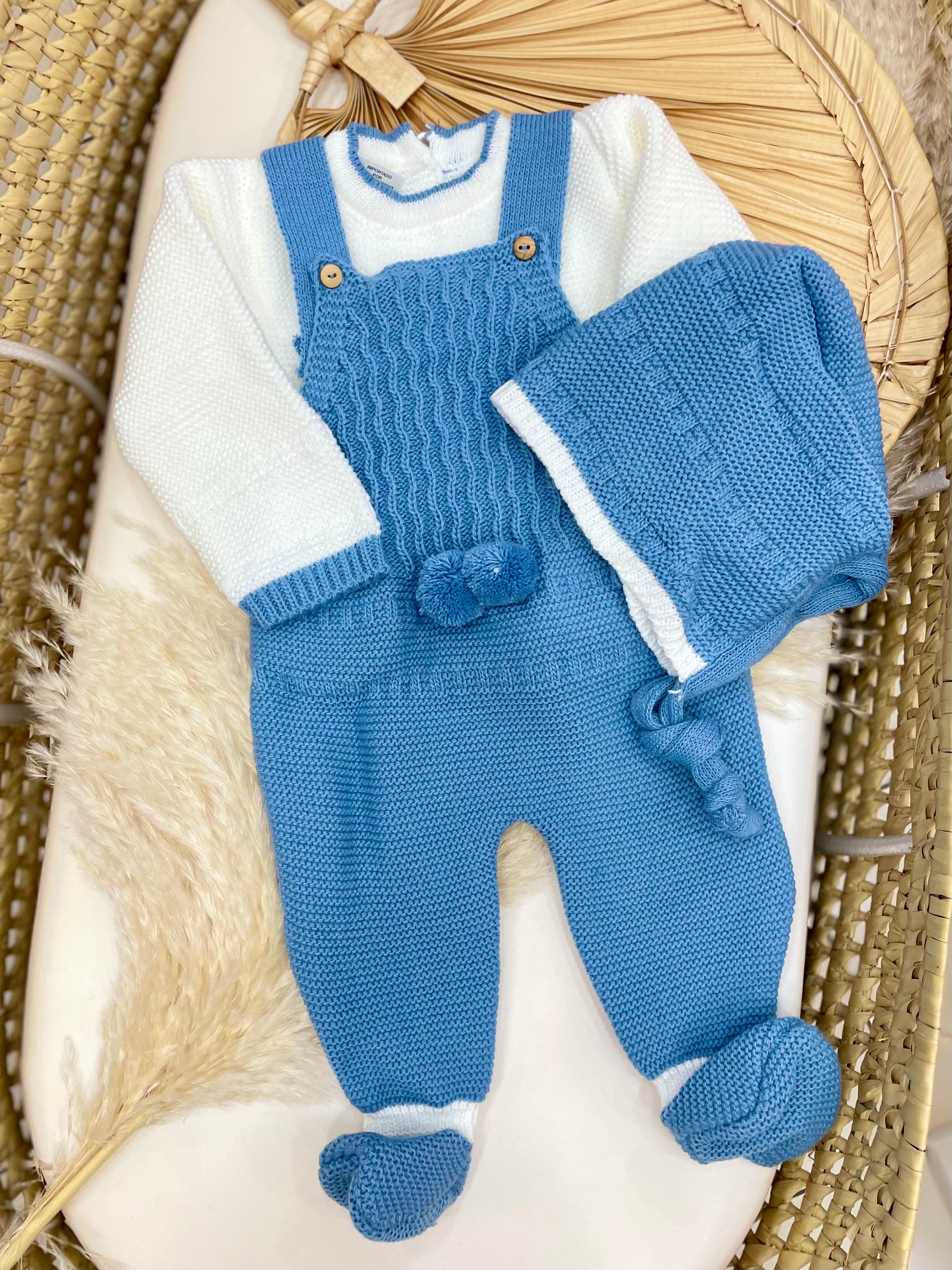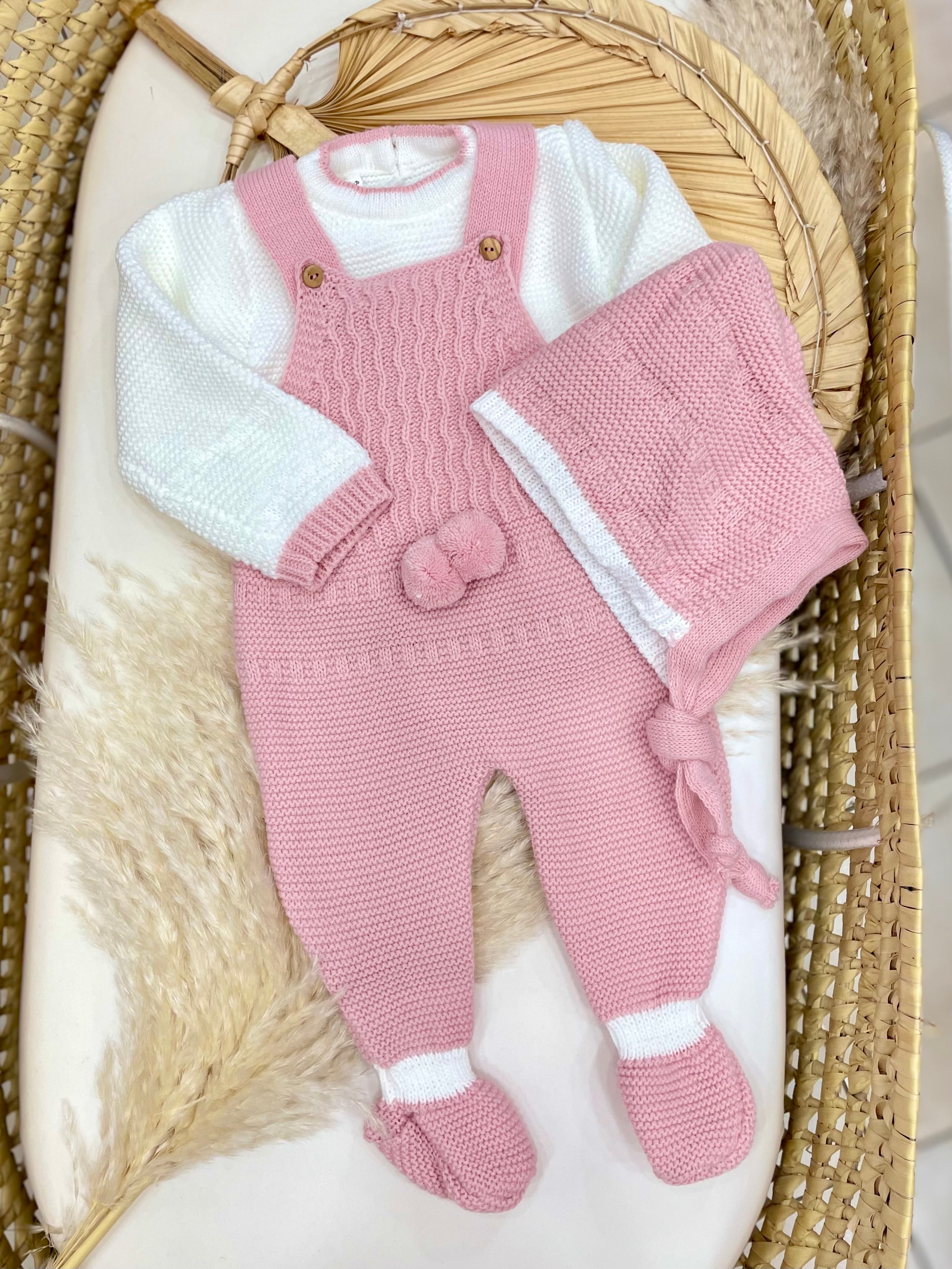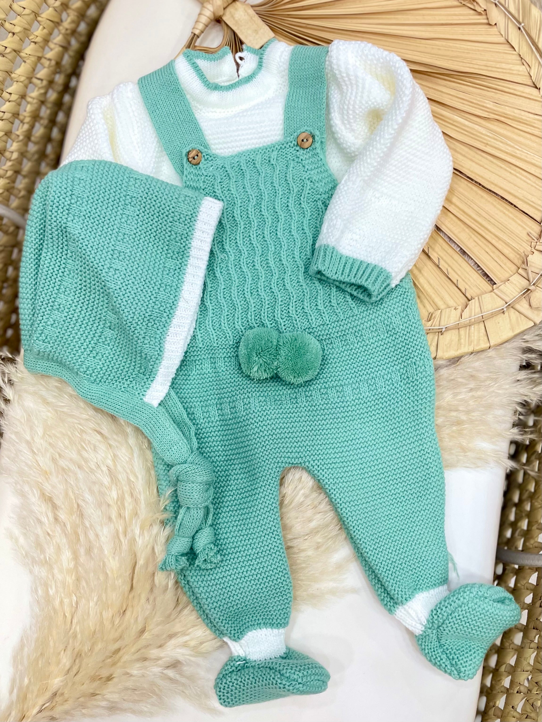 Completo in lana acrilica composto da salopette, maglioncino e cappellino