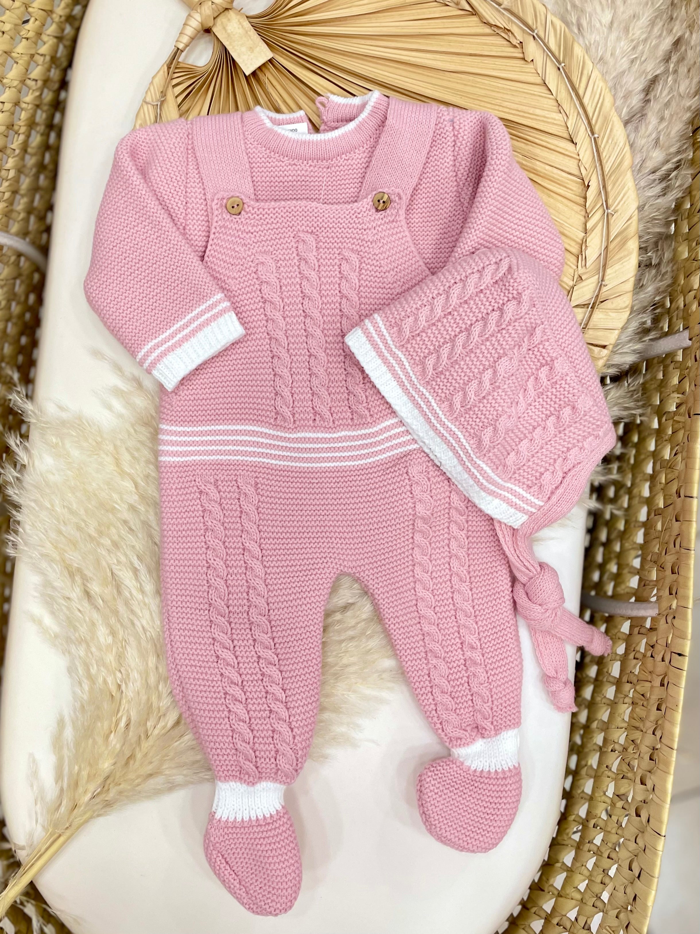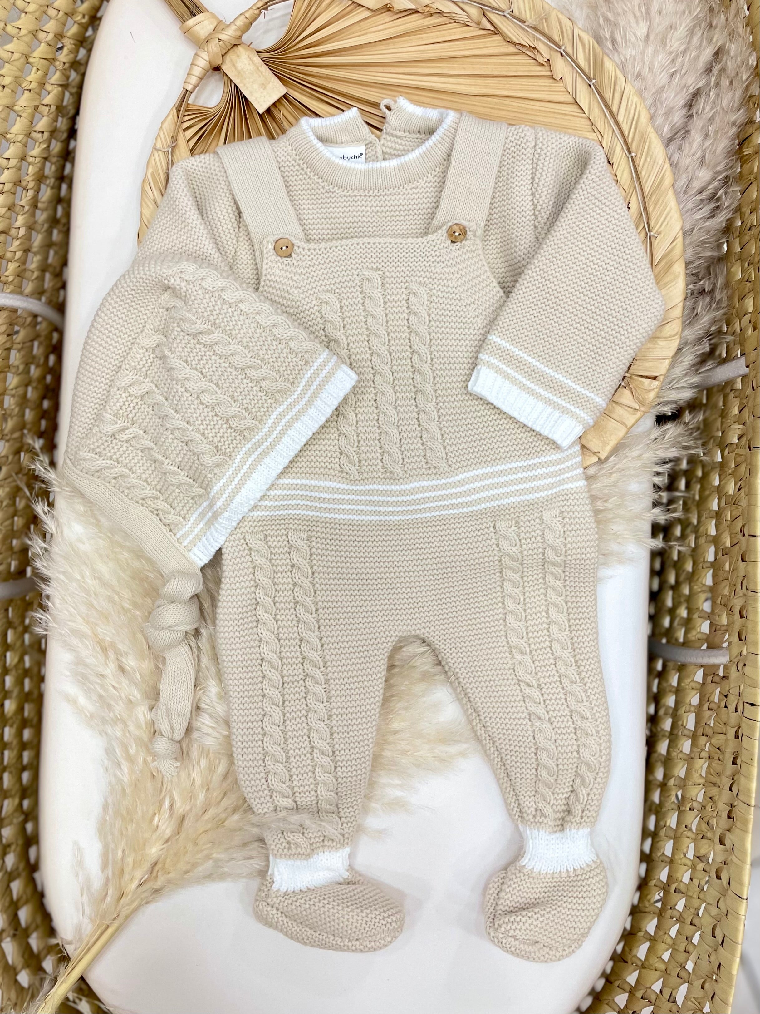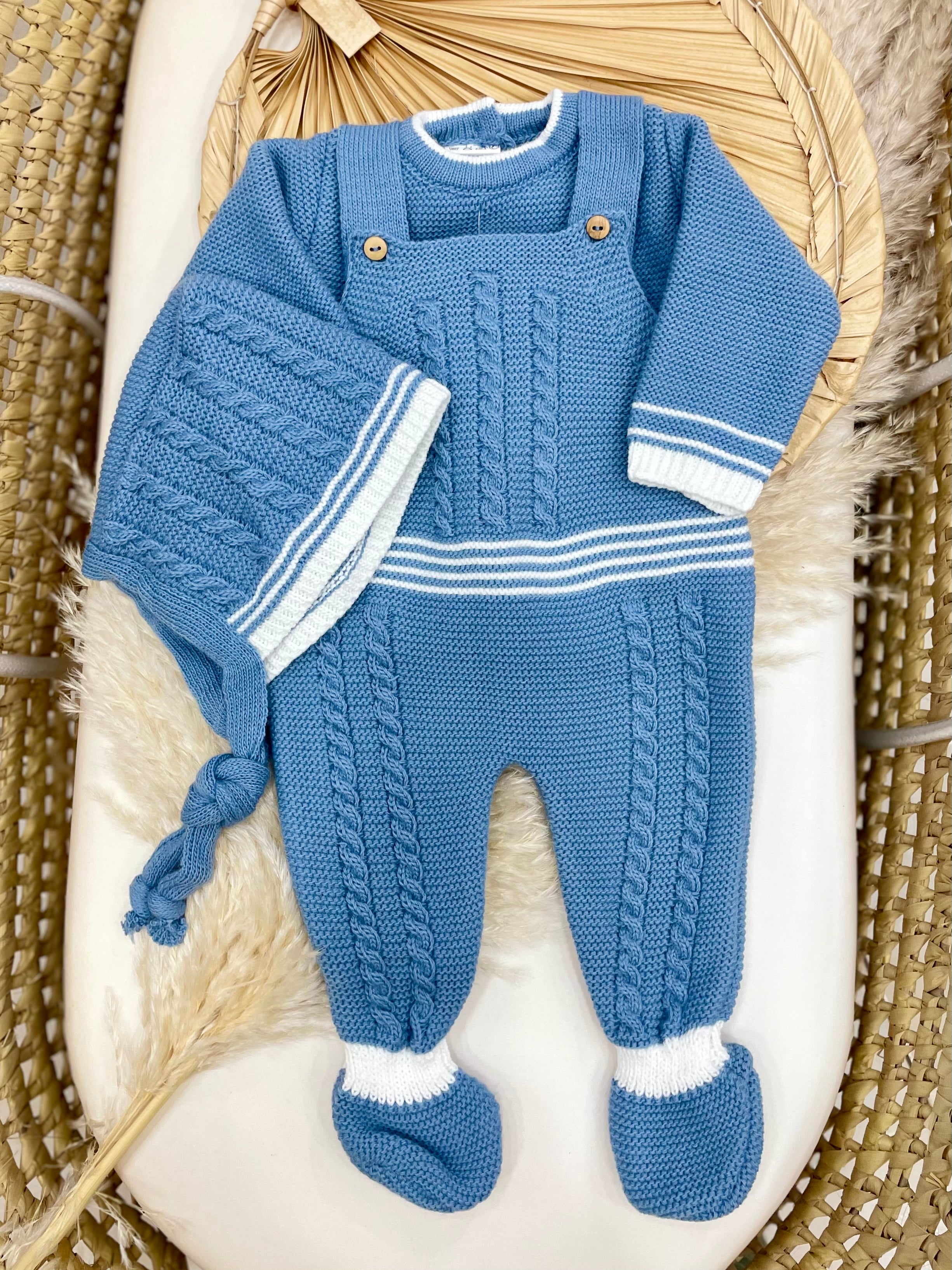 Completo in lana acrilica composto da salopette, maglioncino e cappellino