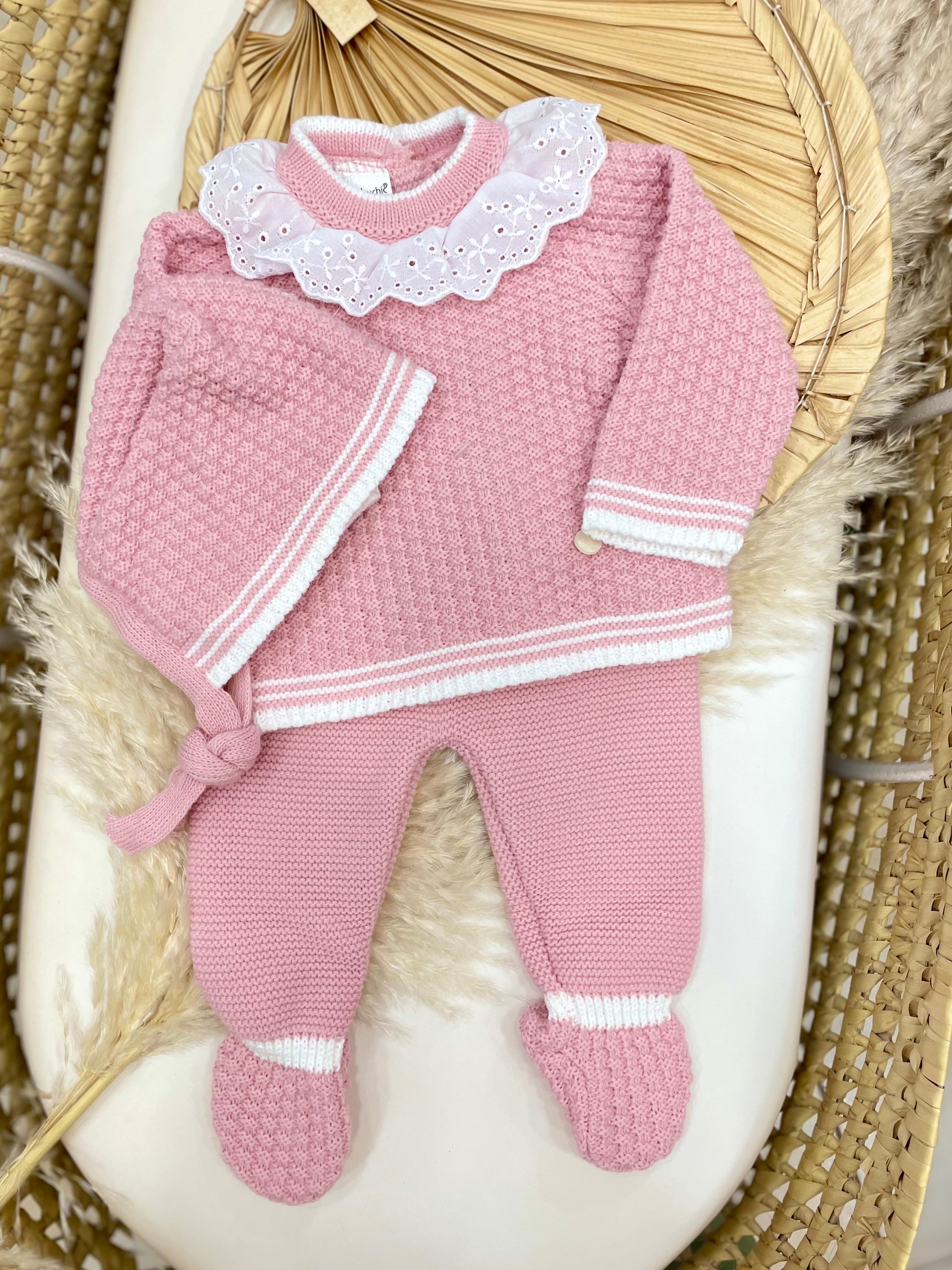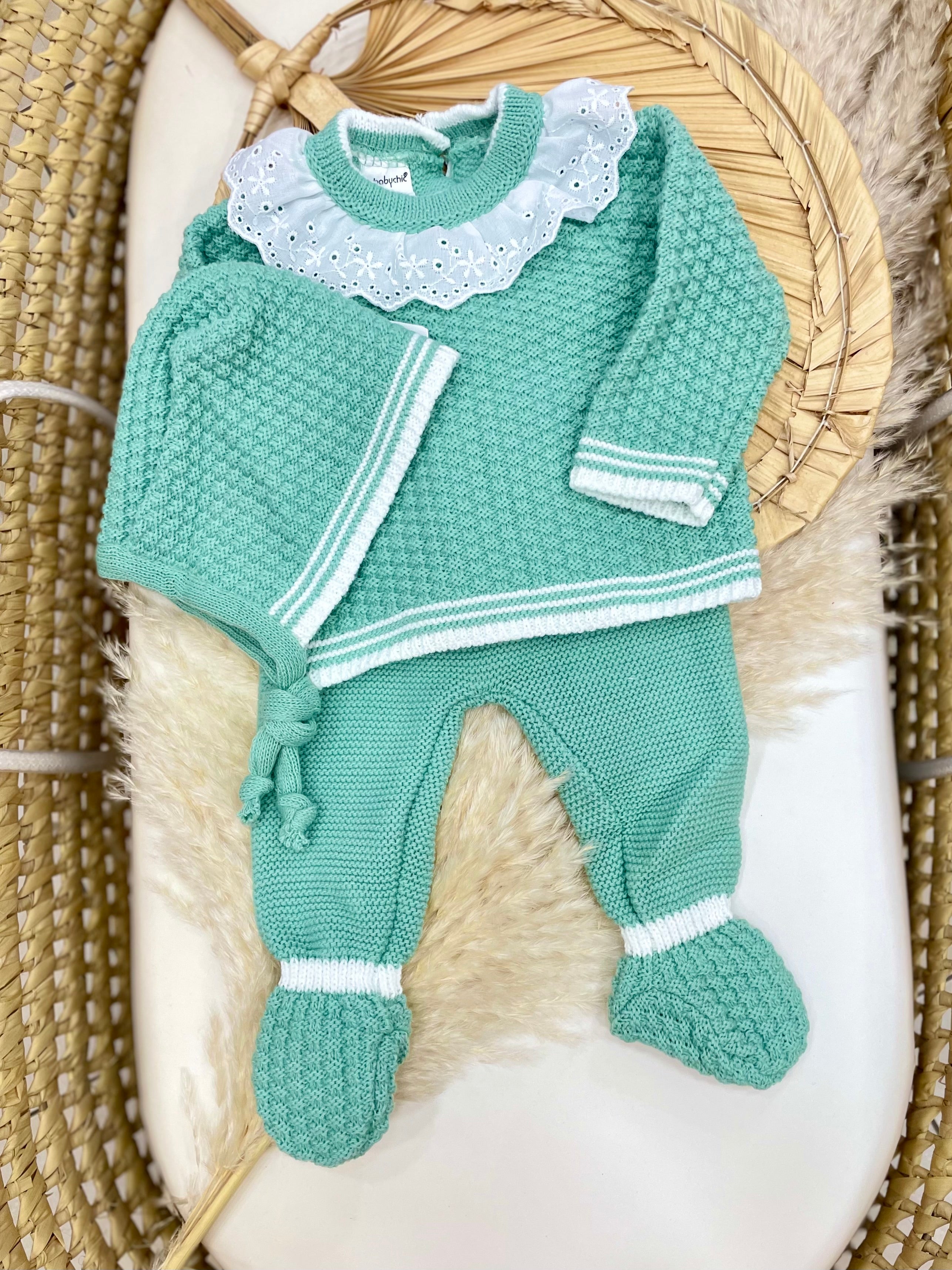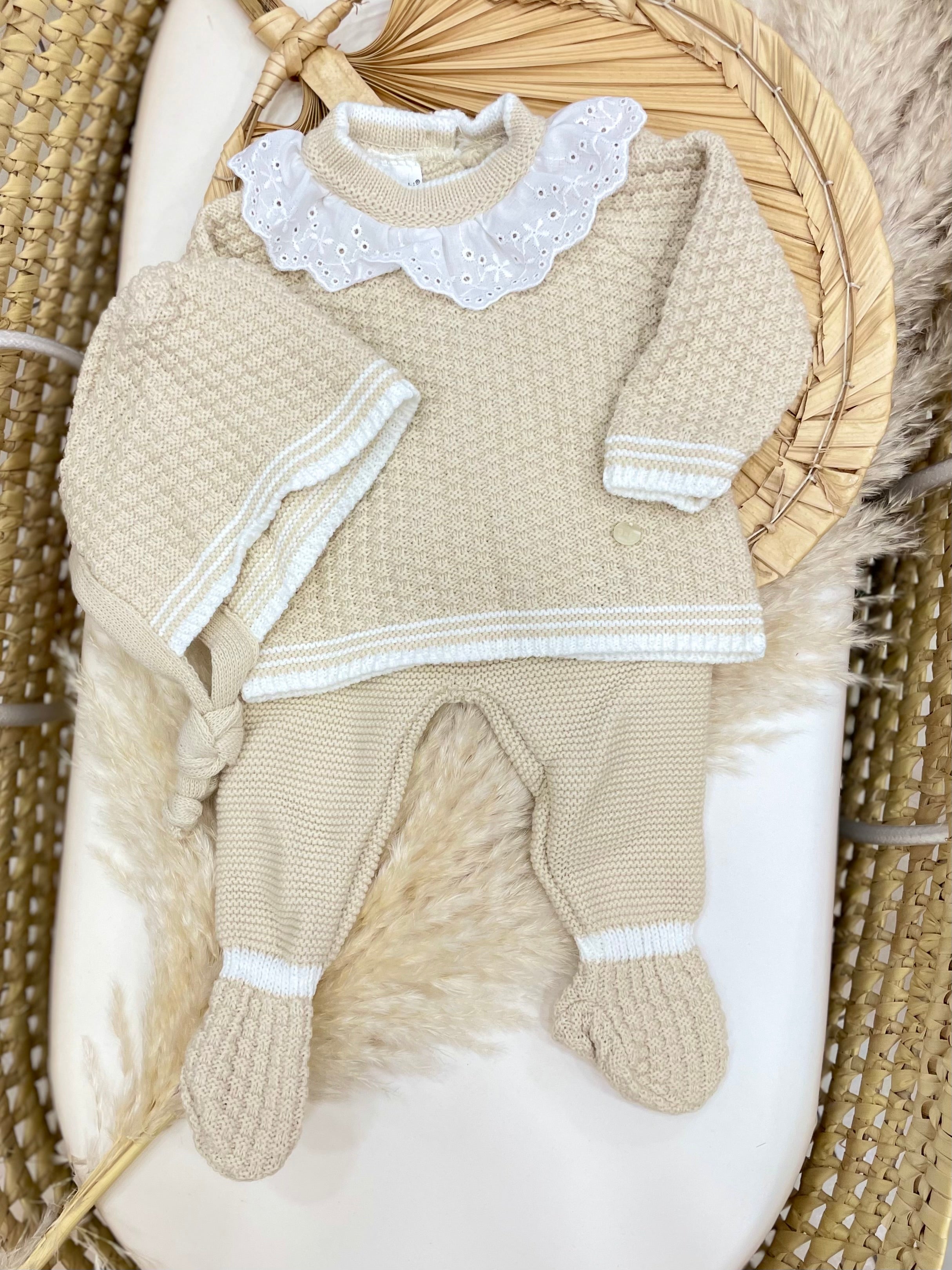 Completo in lana acrilica composto da maglia, pantalone e cappello