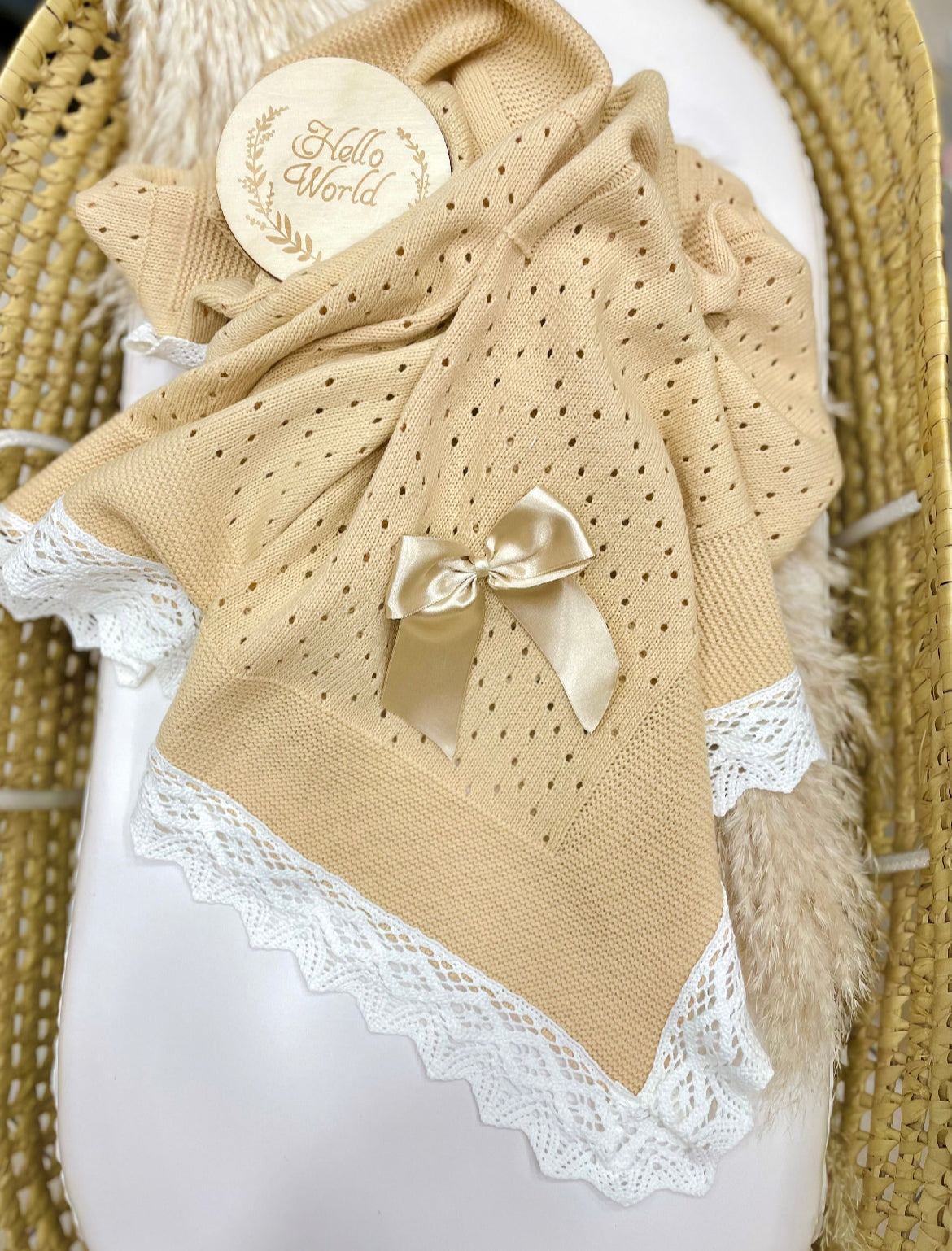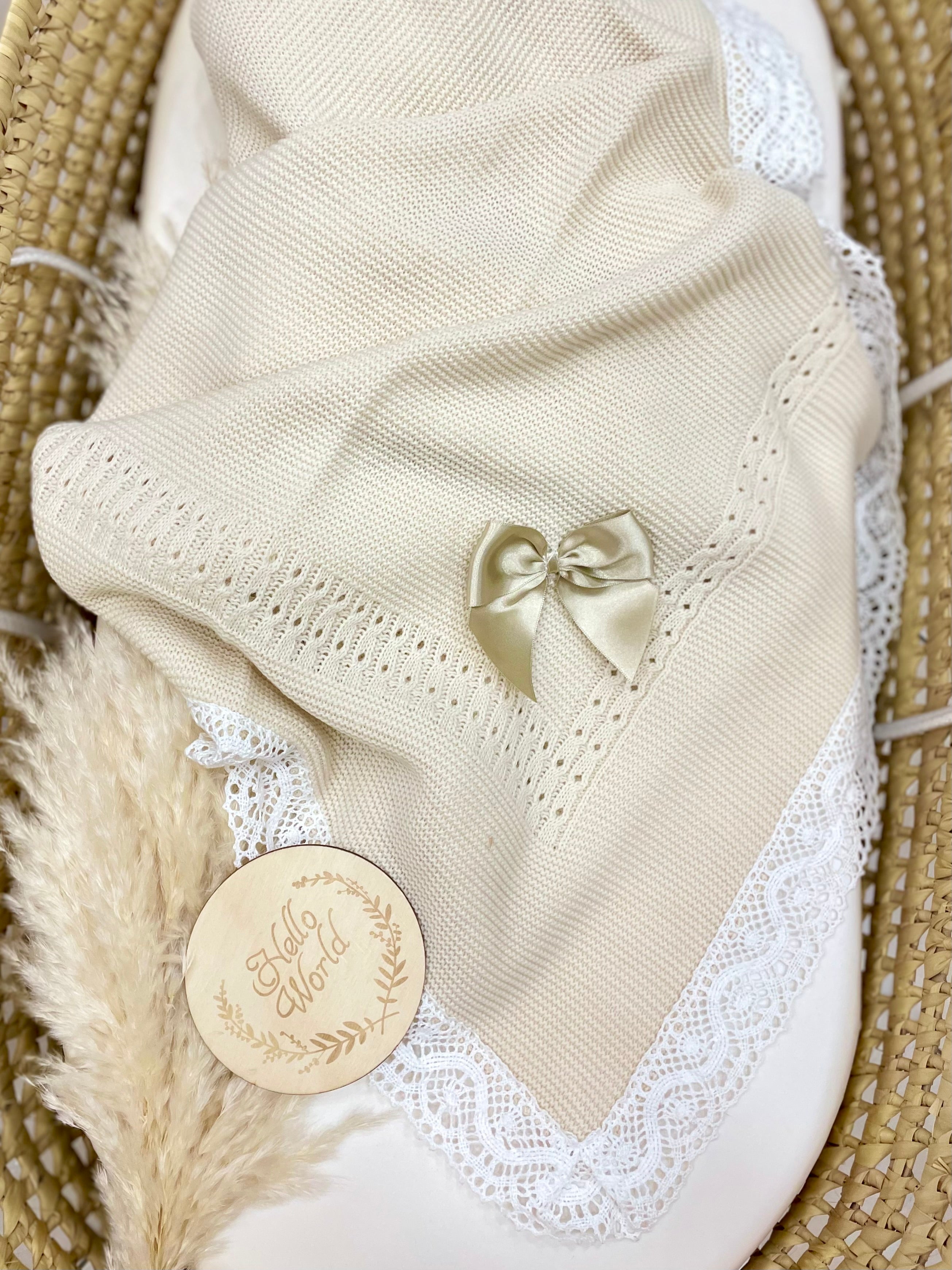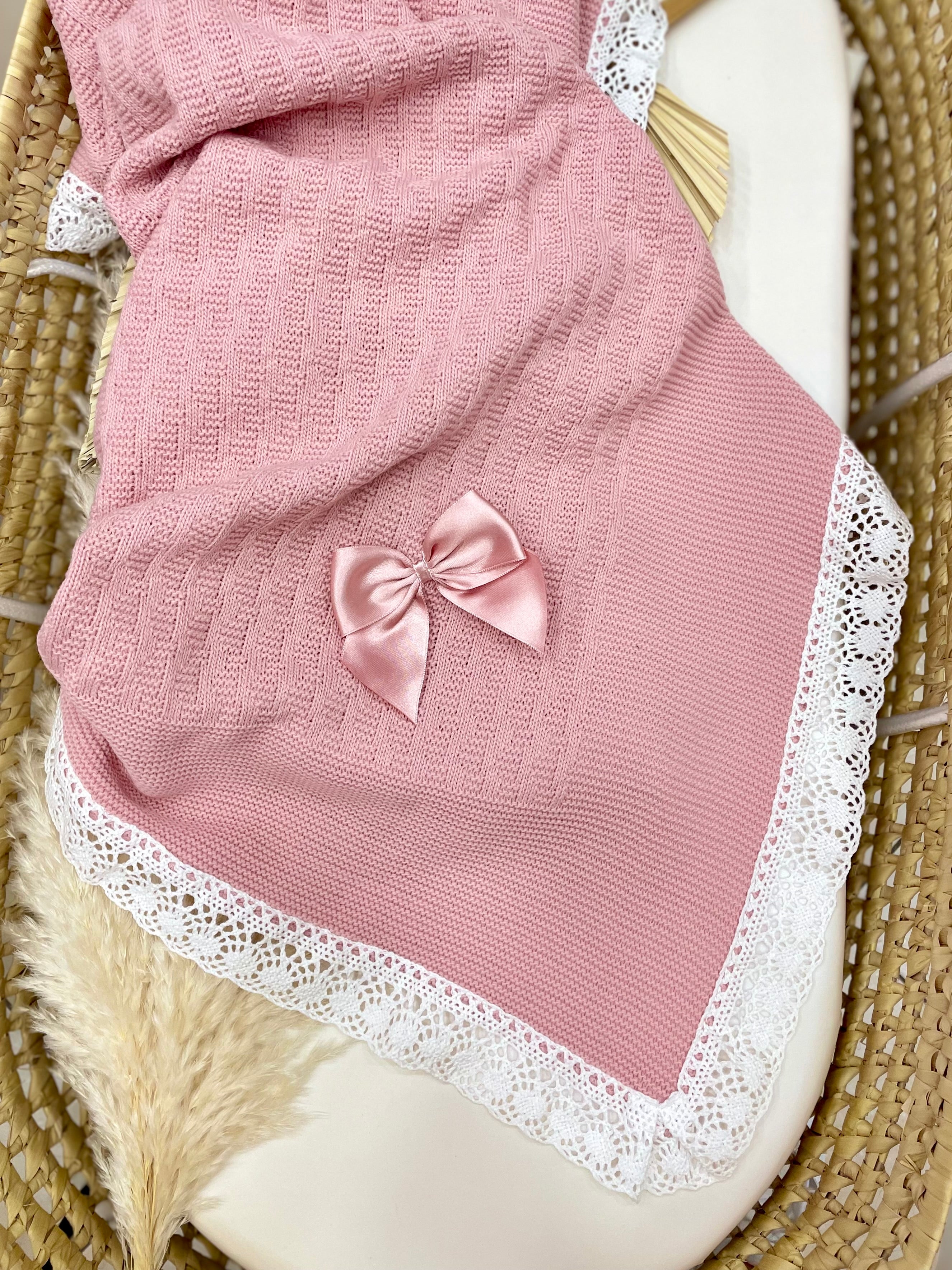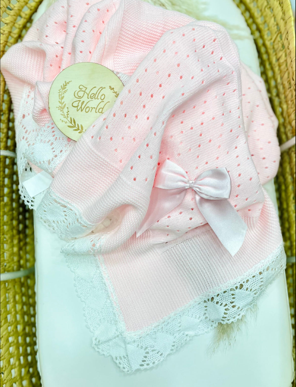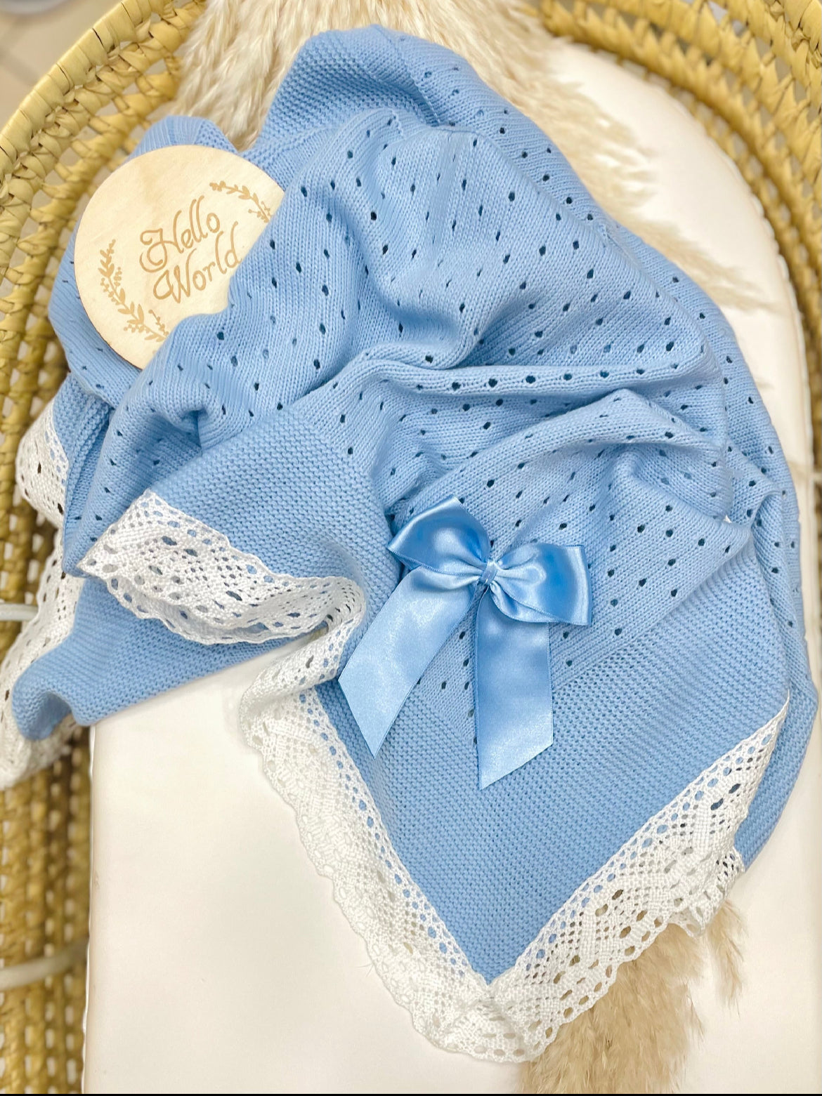 Una morbida e calda copertina decorata con traforo e merletto, impreziosita da un fantastico fiocchettino in raso in tessuto acrilico